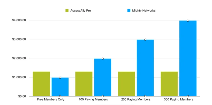 When deciding between AccessAlly and Mighty Networks, the pricing boxes don’t paint the whole picture. If you plan to offer only free content to your members, then Mighty Networks’ plans are more affordable.
